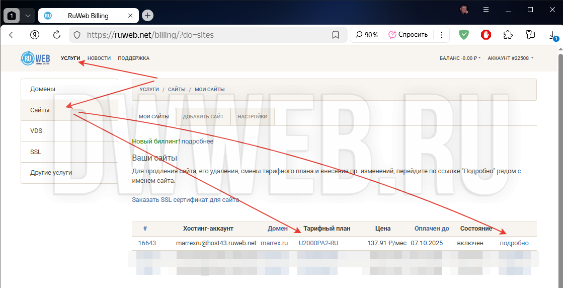 Заходим в свой аккаунт на сайте ruweb.net – далее идем в меню – сайты – подробнее.