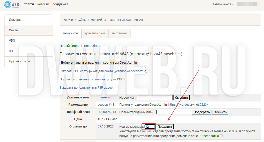 Продление хостинга на ruweb в новом дизайне...