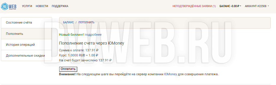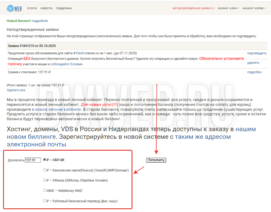 Наконец-то переходим к оплате продления хостинга на ruweb.