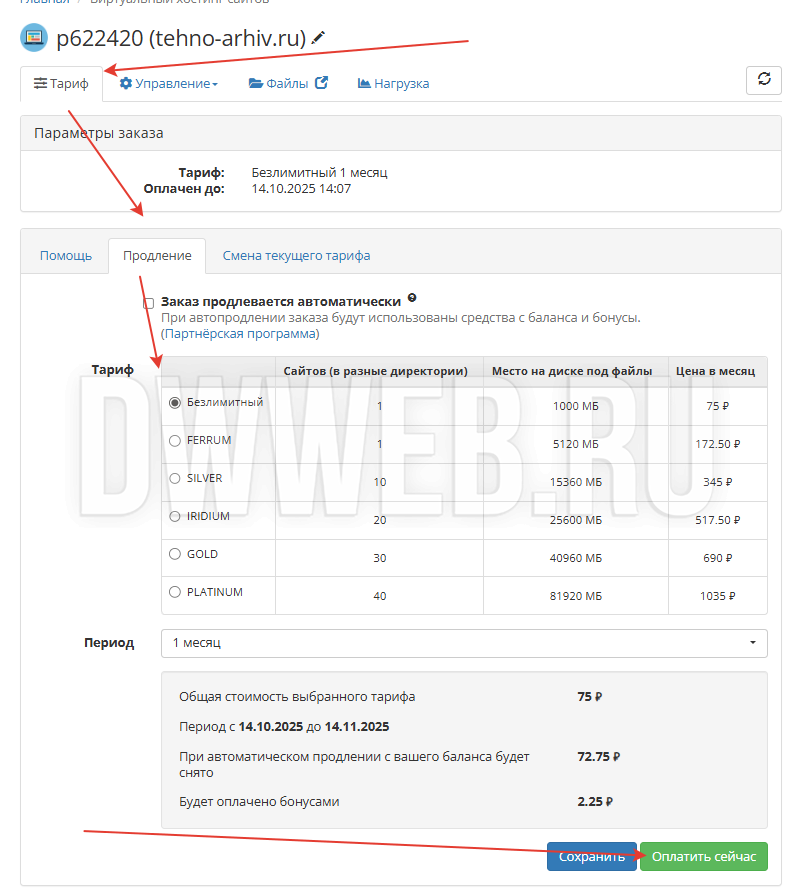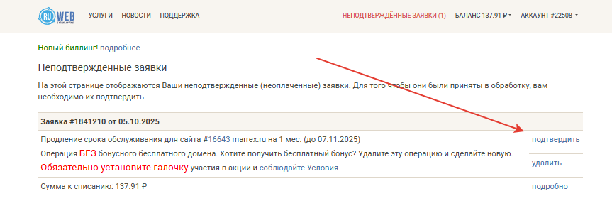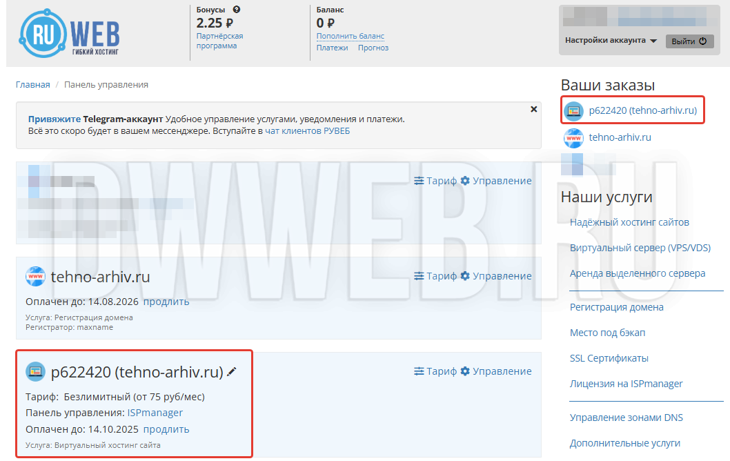 Продление хостинга на Ruweb