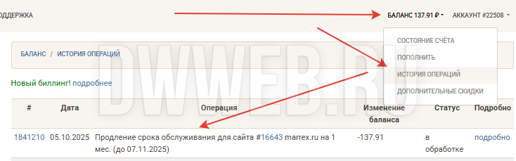 Смотрим как идет процесс продления хостинга: