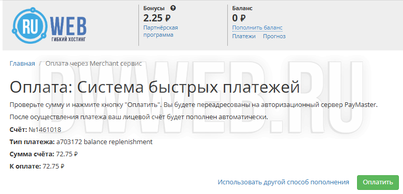 Пополняем баланс для продления хостинга.